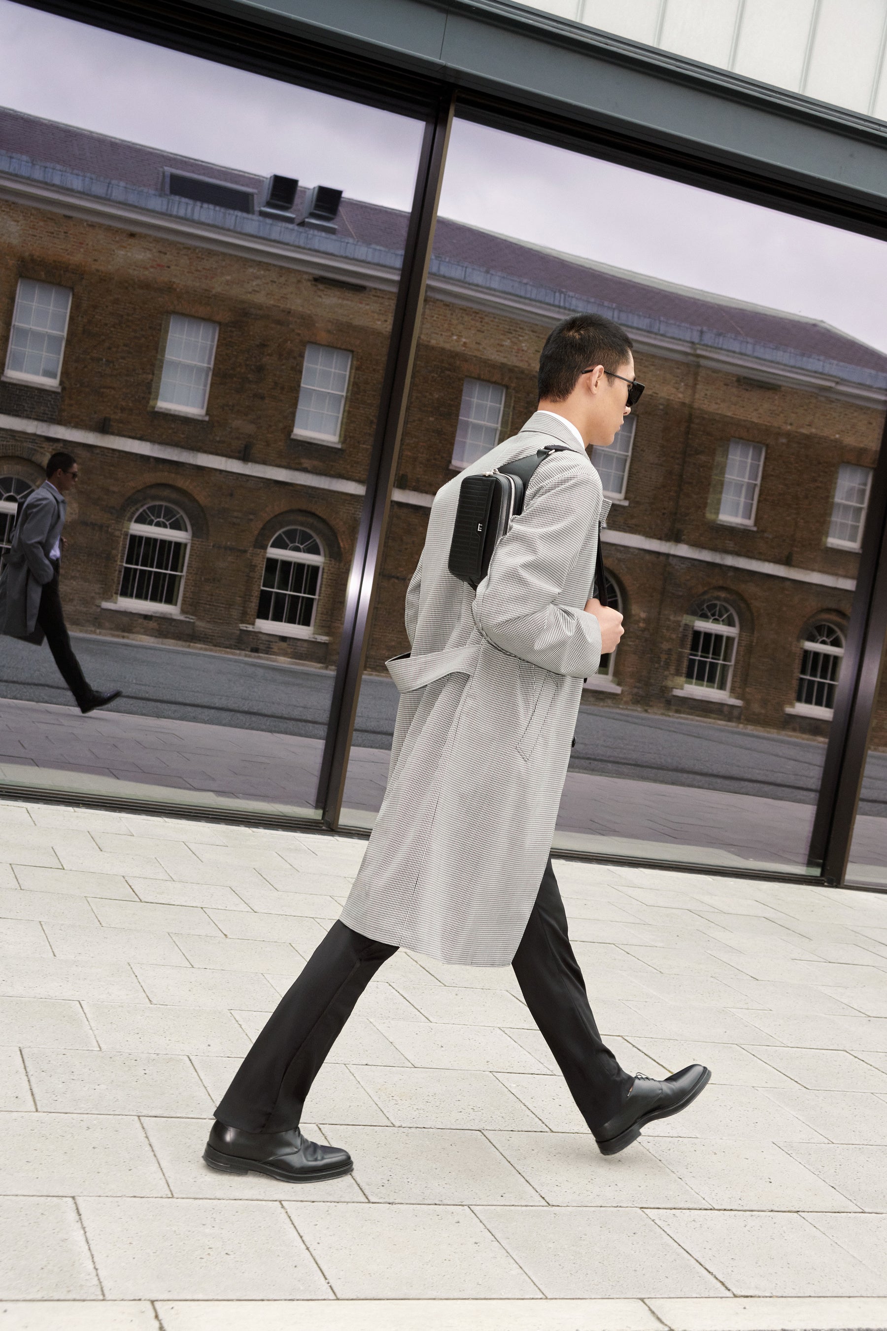 ダンヒルのアーカイブから着想した今シーズンのアンブレラコートは、1900年代における重衣料の完全防水の実験から生まれたもので、防水性と防シワ効果を兼ね備えた超軽量加工のウールシルクで再デザインされています。このコートには単なる技術だけでなく、過去に影響を受けながら現代的なデザインに落とし込む、ダンヒルの哲学が込められています。