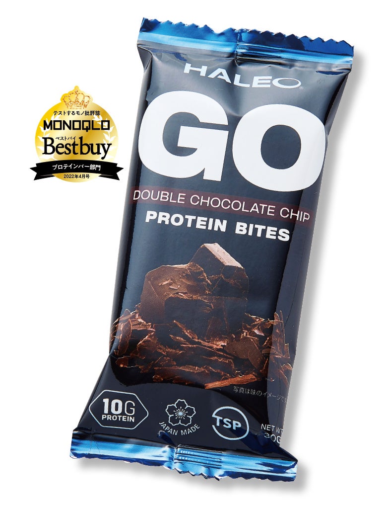 「HALEO」は成分構成が高く評価されました。プロテインバーはプロテインの独特な風味を隠すために添加物が使われていることが多く、HALEOにも使用されています。しかし、その種類が少なく、シンプルなレシピで安心。食物繊維も豊富です。食物繊維の働きにより血糖値の上昇が抑えられ、中性脂肪がつきにくいと考えられます。薄いココア風味で食べやすく、ソフトキャンディーのような食感でしっかり噛まなければならないため満足感がありました。肝心のプロテインは乳由来のものが使われています。1袋の量が少ないためたんぱく質量は少ないですが、その分、カロリーや糖質も抑えられるので、食べすぎに注意したい人にうってつけです。