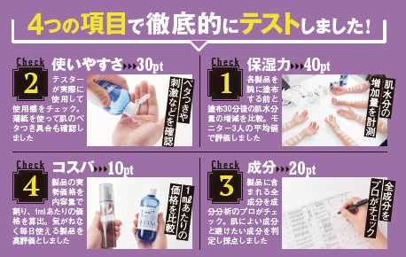 保湿力テストでは塗布前後の肌水分量の差が平均で31.5と高い数値を記録。エイジングや乾燥などでダメージを負った肌に潤いを与えてくれることが実証されました。成分面でも、3種のビタミン類が毛穴の引き締めや血行促進に作用し肌荒れやエイジングケアに効果が期待できます。使いやすさ項目では、ジェルのような質感で肌のベタつきを感じるモニターもいましたが、数分で気にならない程度に。また、刺激を感じやすいエタノールなどの指定成分は入っておらず、肌の弱い人でも比較的使いやすい1本と言えます。