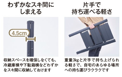 5cmのスキ間にスッとしまえる超スマートな脚立。家の中で使うには十分な高さのある三段ステップながら、アルミ製で重さはわずか3kgと超軽量。開閉がやや硬いので慣れるまでコツが必要ですが、安定感があって快適に上り下りできる脚立です。