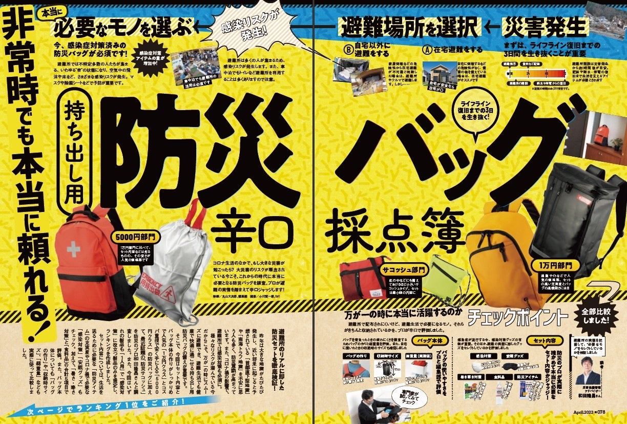 昨年は大きな地震がたびたび発生し、近い将来に起こると予想されている「首都直下型地震」や「南海トラフ地震」を不安に思う人も多く、防災意識が高まっています。また、コロナ禍の影響で、避難所では感染対策も必須に。様々なリスクが潜んでいる今だからこそ、万が一の時にスムーズに避難でき、避難生活でも健康で快適に過ごせる持ち出し用防災バッグの備えが重要です。そこで、セット内容とバッグ本体の作りがしっかりめで人気の「1万円クラス」とコスパ重視で安く手に入る「5000円クラス」の防災バッグに加えて、最近話題の「防災サコッシュ」を防災のプロと調査しました。