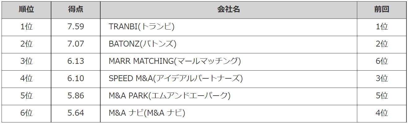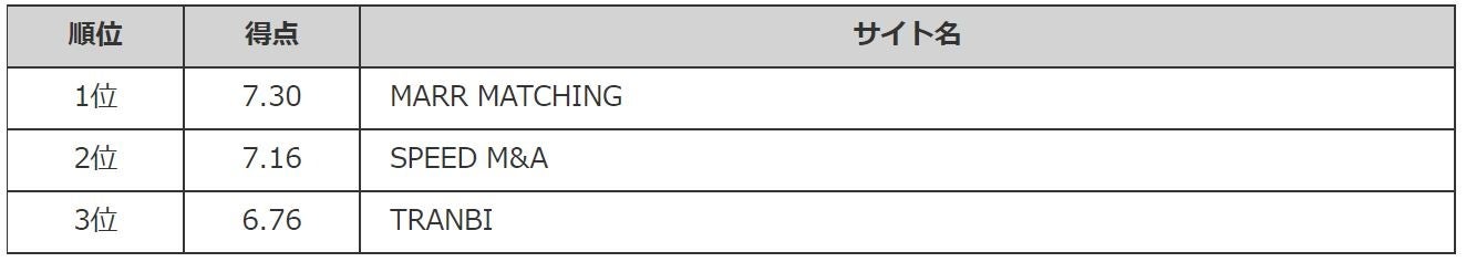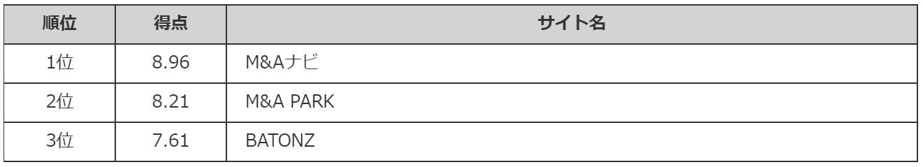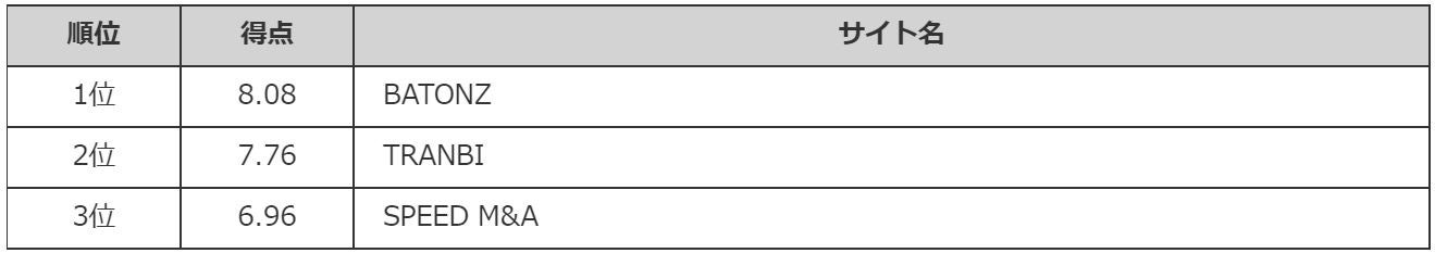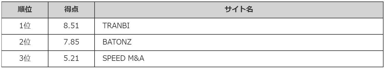 「Gomez M&Aプラットフォームサイトランキング2022」の結果は、次の通りです。