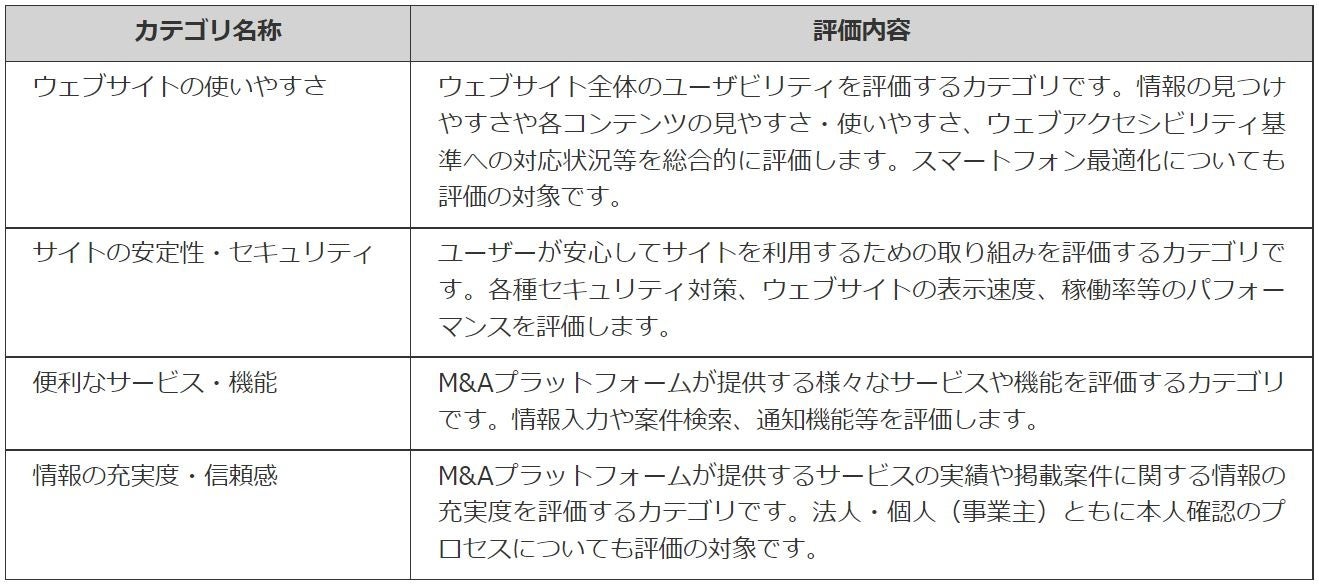 こうした社会的背景も踏まえ、当社では売り手・買い手ともに幅広く門戸を開きサービスを提供するM&Aプラットフォームについて2021年よりランキング調査を開始しました。本調査は、M&Aプラットフォームのユーザーとなる掲載案件の売り手・買い手双方の視点に基づく「ウェブサイトの使いやすさ」「サイトの安定性・セキュリティ」「便利なサービス・機能」「情報の充実度・信頼感」の4つの切り口(カテゴリー)から構成される99の調査項目について当社アナリストが評価を行い、総合的に優れたM&Aプラットフォームサイトのランキングを決定しています。