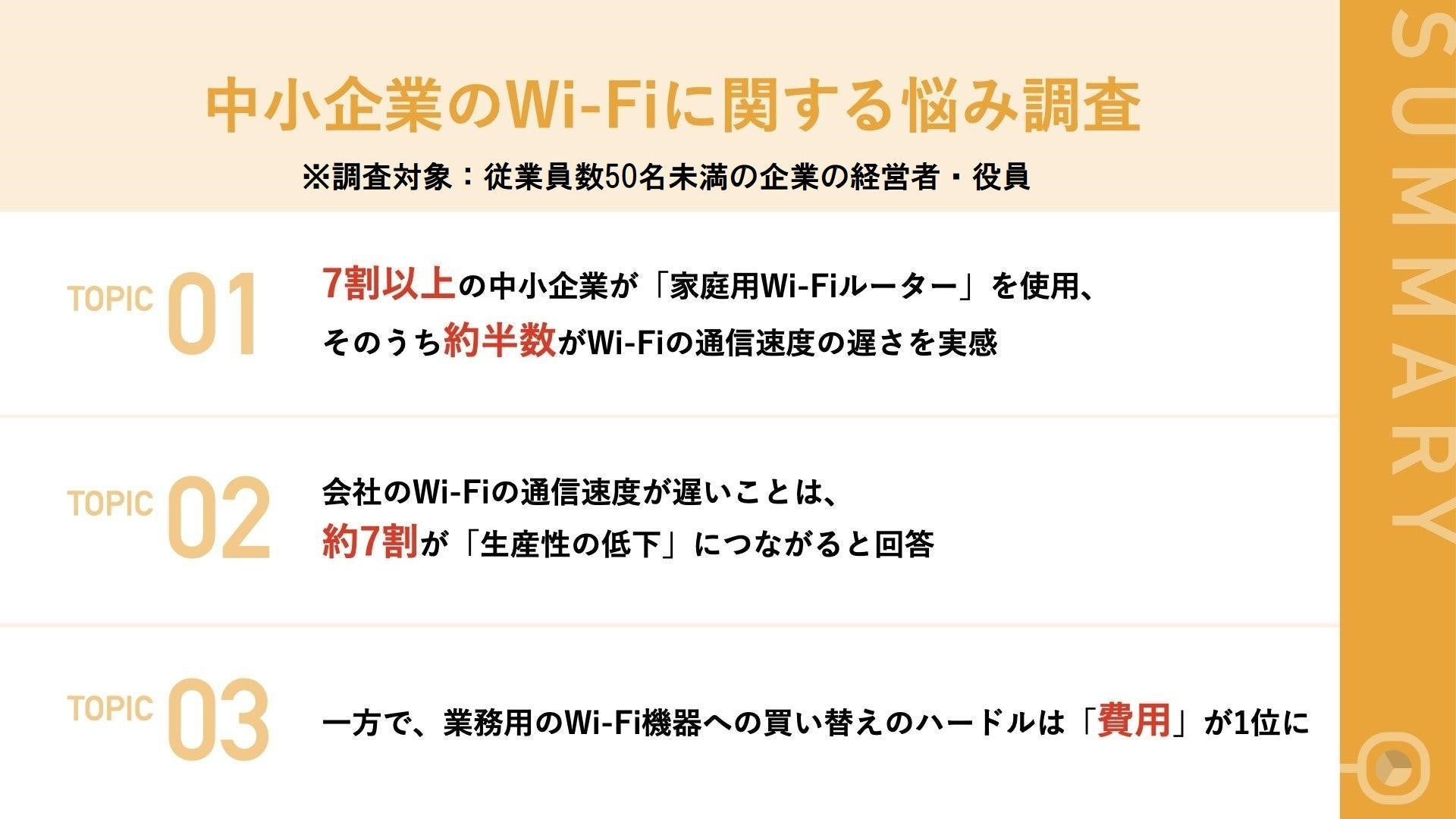 【「Wi-Fiがつながらない!」中小企業の通信環境を調査】従業員数50名未満の中小企業の72.7%が「家庭用Wi-Fiルーター」を使用通信速度の遅さによる「生産性の低下」に悩み多数