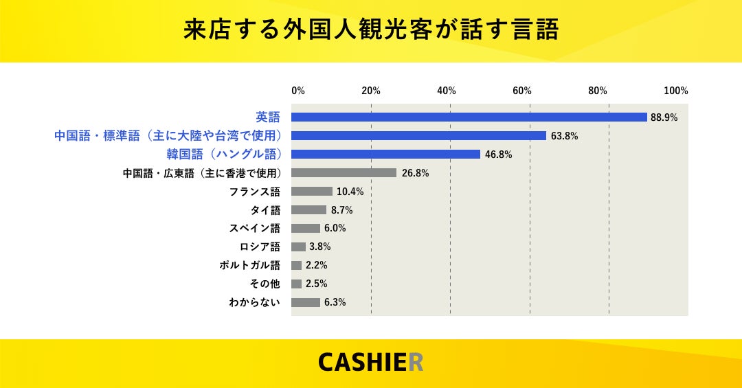 農林水産省委託事業「多言語化対応調査事業報告書」によると、来店する外国人客が話す言語は、英語が88.9%と一番多く、次に中国語・標準語が63.8%、韓国語が46.8%ということが明らかになっています。