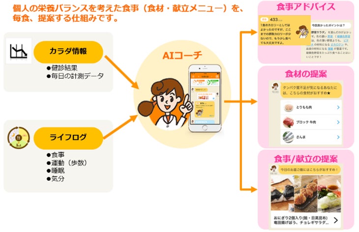 新機能「パーソナル提案」では、ユーザーの栄養バランスや運動状況、消費・摂取カロリーに合わせて、食事メニューや食材を提案します。