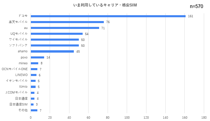 「いま利用中のキャリア・格安SIMはどこですか?」と質問した所、最も契約者が多かったのはドコモで161名でした。
