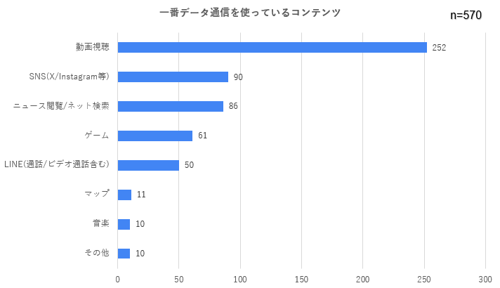 続いてSNSやニュース/ネット検索、ゲーム、LINEでデータを消費している方も多くいました。そのほか、学習系アプリやライブ配信、電子書籍アプリをメインで使っている方もいるようです。