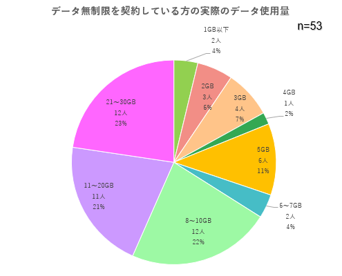 以下は、データ無制限プランを契約している53名の実際のデータ使用量を集計したグラフです(段階制のワンプランしかない楽天モバイルは除く)。