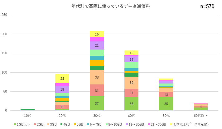すべての回答者が30GB以下に収まっていることから、プランを見直すことで毎月の通信料を安く抑えられる可能性が高いと言えます。