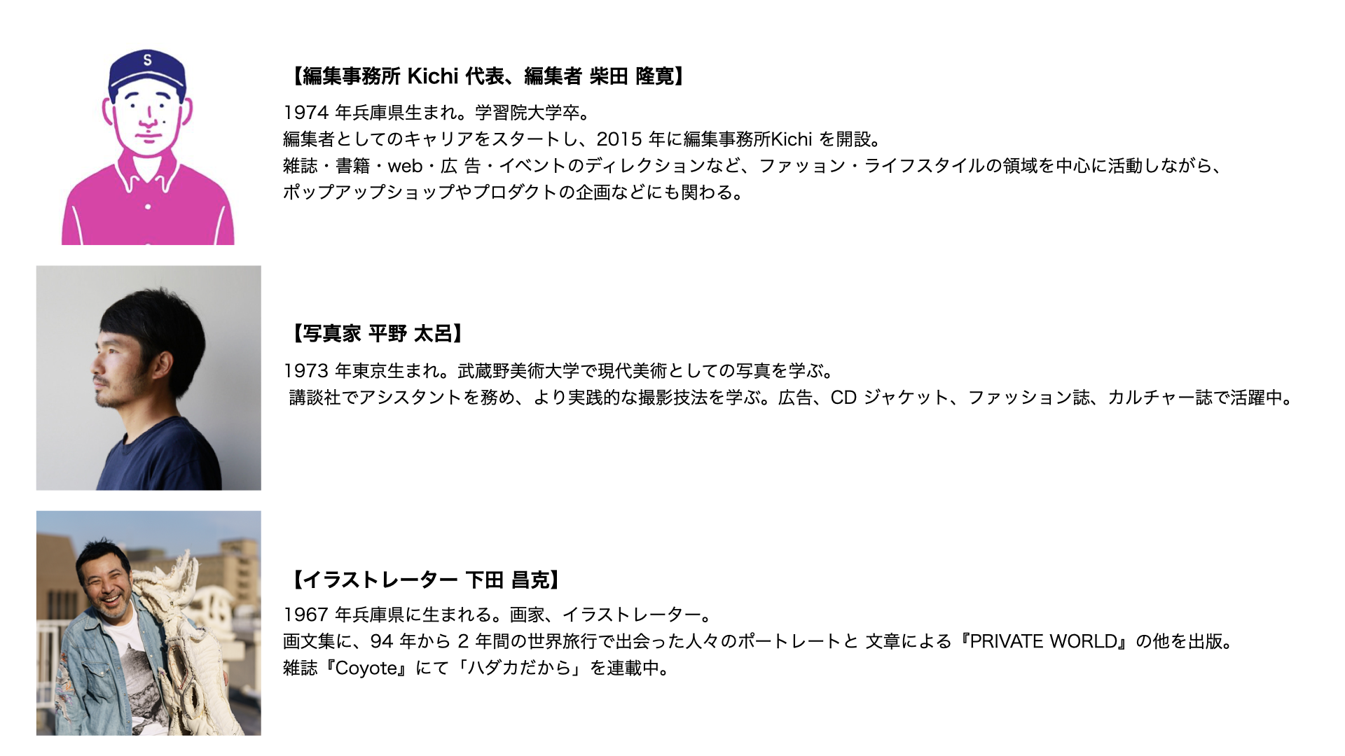 特別講師:編集事務所 Kichi 代表 編集者 柴田 隆寛、写真家 平野 太呂、イラストレーター 下田 昌克