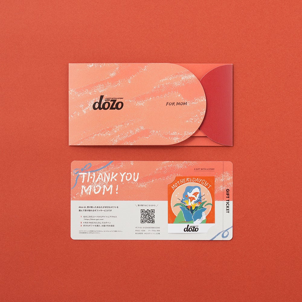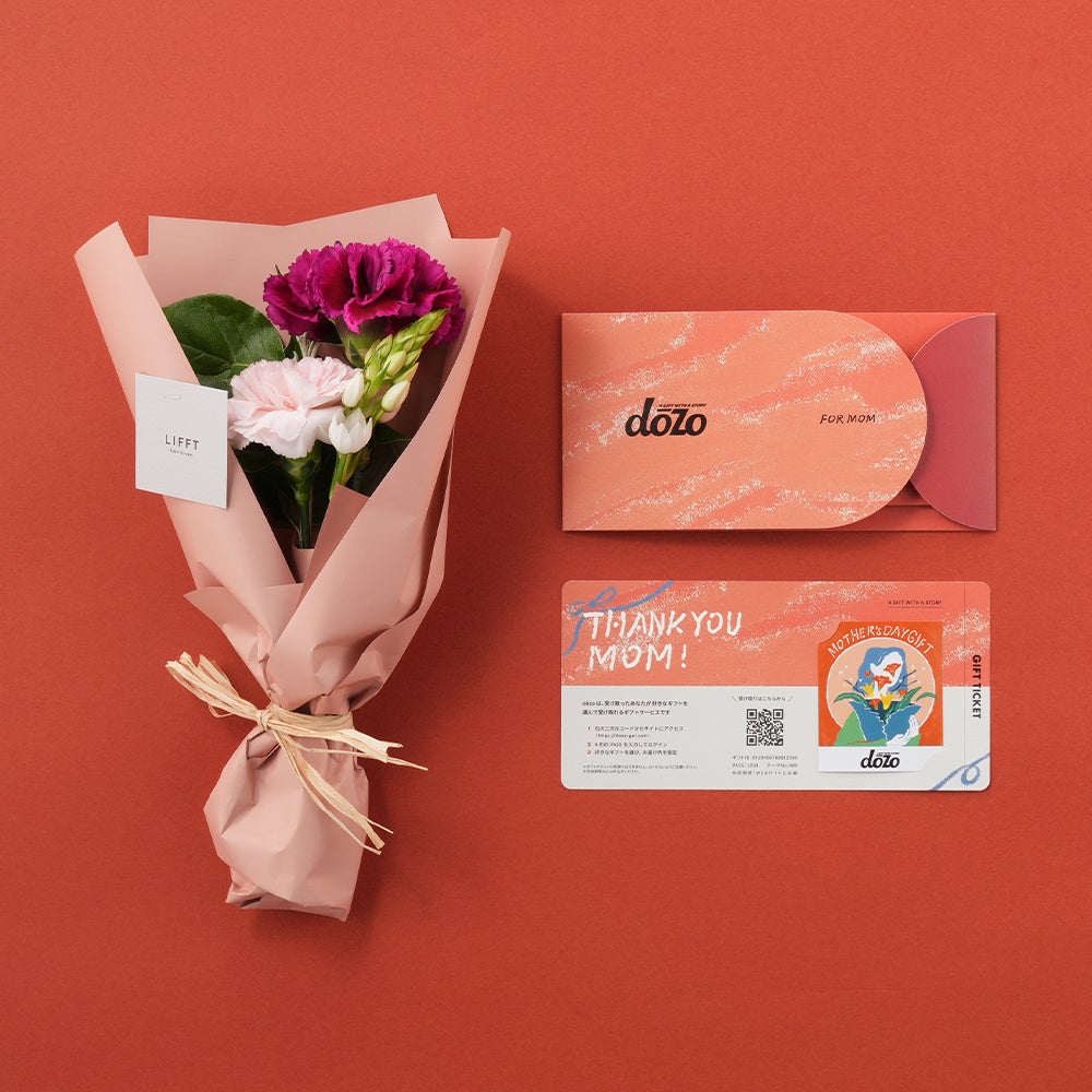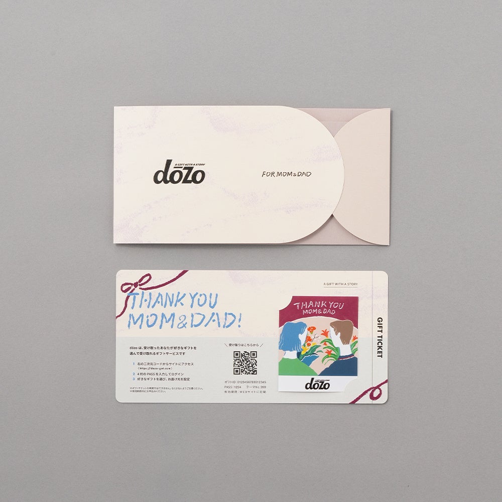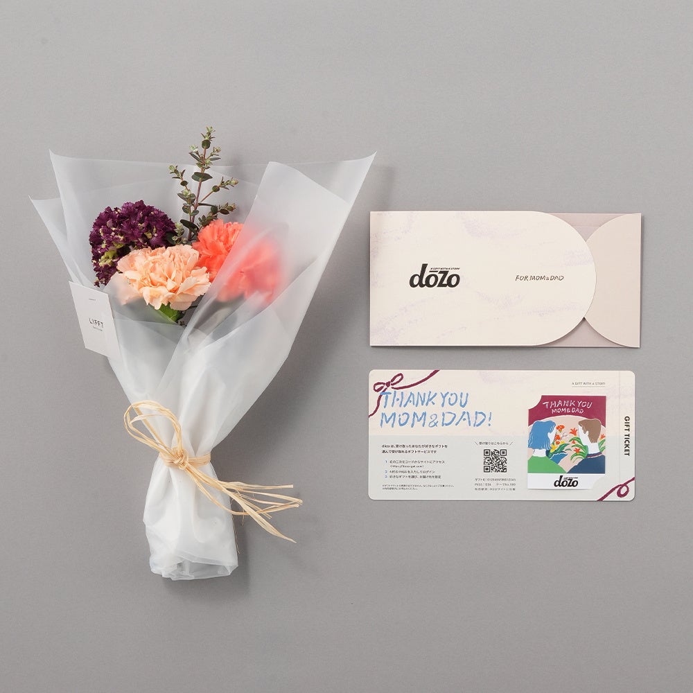 「dōzo for MOM」「dōzo for DAD」「dōzo for MOM&DAD」は、それぞれ「ギフトチケット&ブーケセット(※)」、「ギフトチケット」、「ソーシャルギフト」の3形態から贈り方をお選びいただけます。手渡ししたい場合や、ブーケなどと一緒に渡したい場合は「ギフトチケット」がおすすめです。遠方に住む相手にスマホで贈りたい方や、当日に手配する場合は「ソーシャルギフト」がおすすめです。