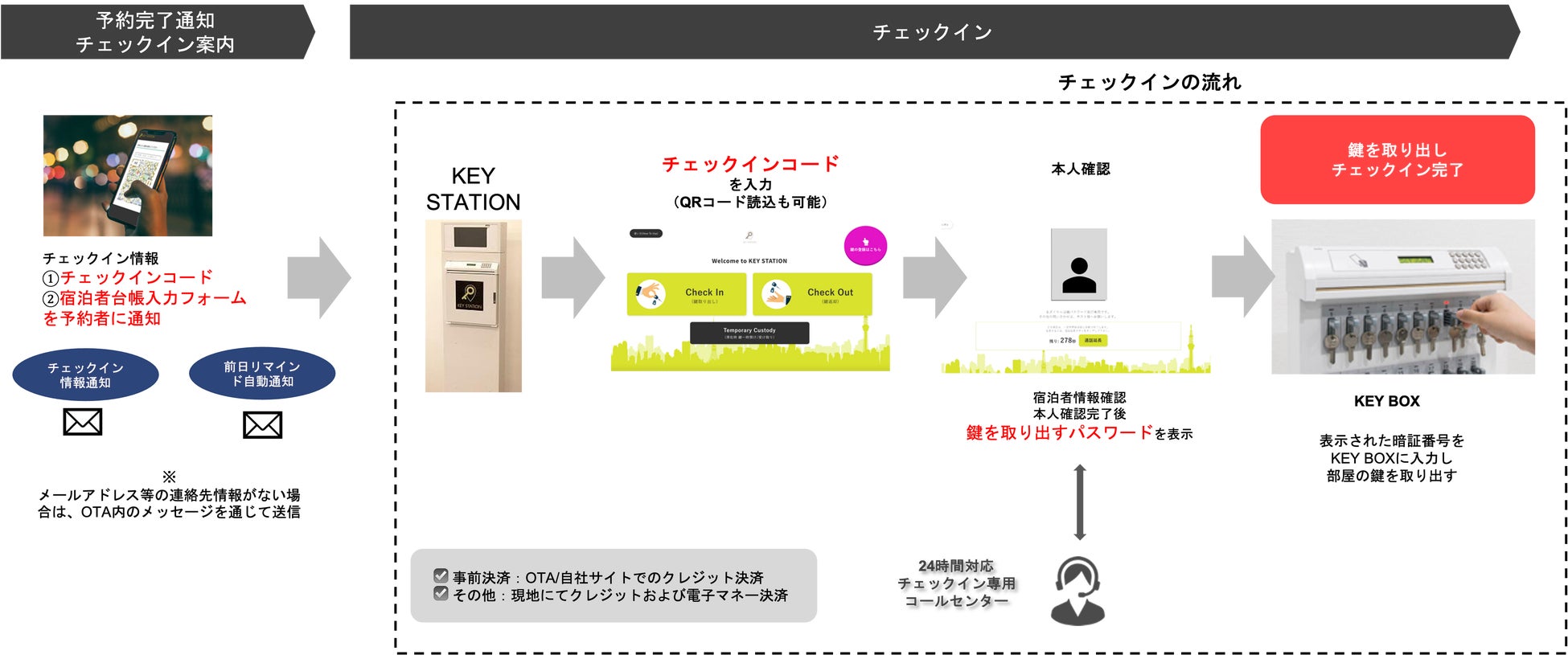 今回のようにホテルのシステムと連携することで無人のチェックインシステムとして、下記の流れを無人化できます。