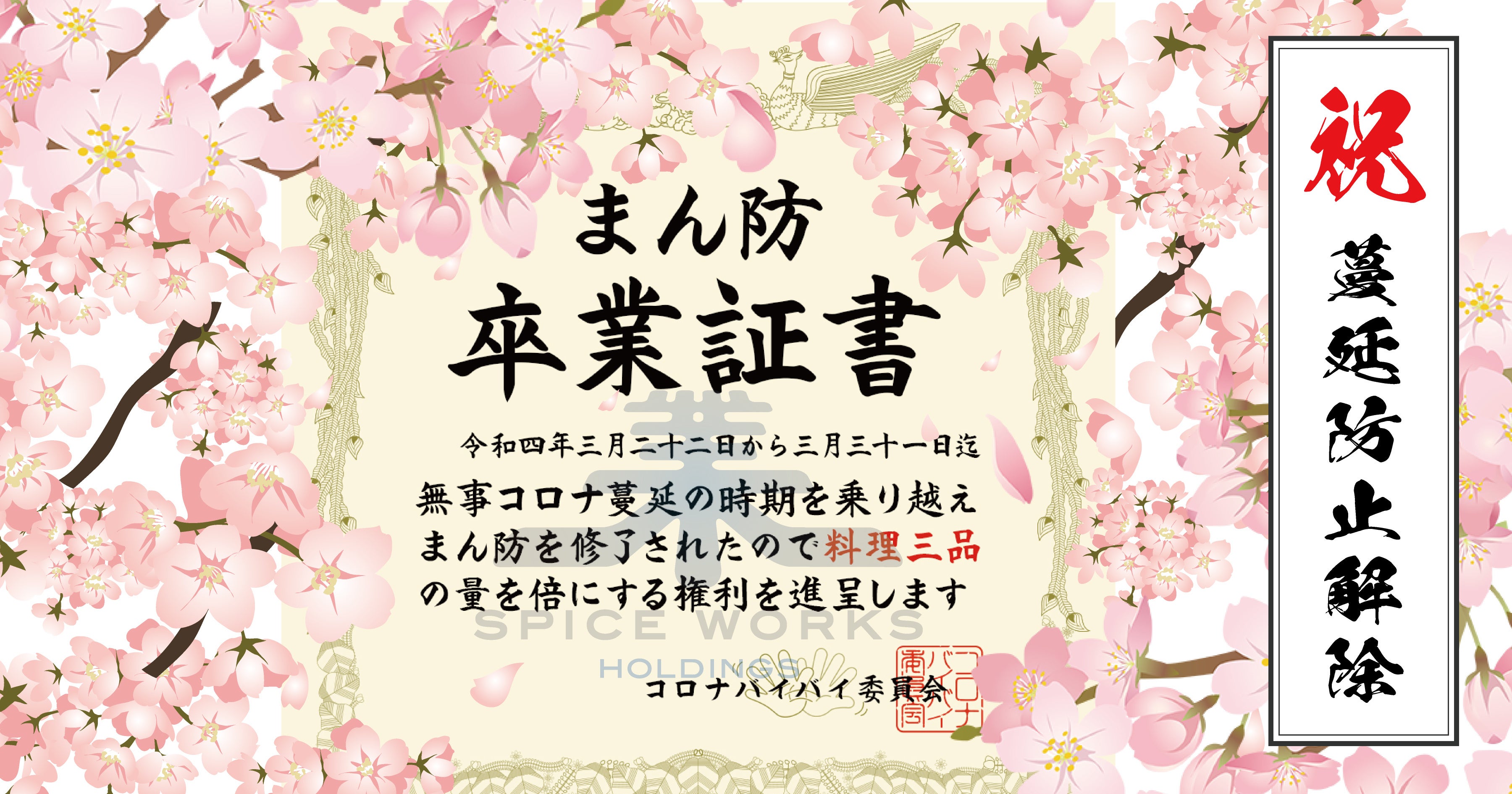 株式会社スパイスワークス(本社:台東区 代表:下遠野亘)は、政府からの新型コロナウイルスまん延防止重点措置全面解除の発令を受け、3月22日より「まん防卒業!コロナバイバイキャンペーン」を営業再開する下記8店舗で実施する事に致しました。
