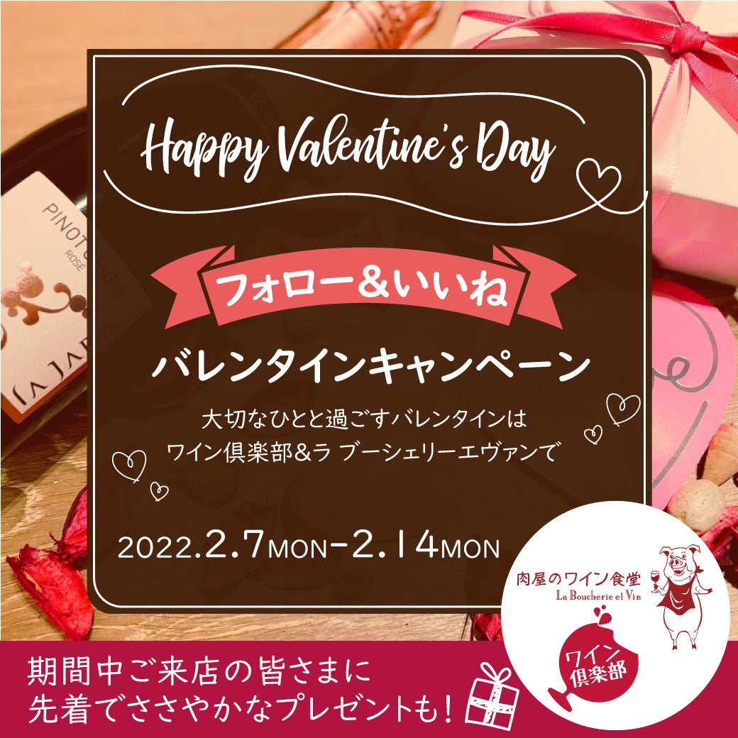 ワインにピッタリな小皿料理で至福の時間を演出する「ワイン倶楽部」ならびに、ワインが大好きな南仏の肉屋さんが始めた陽気でゆかいなワイン食堂「La Boucherie et Vin ラ ブーシェリーエヴァン」では【~Happy Valentine's Day ~フォロー&いいね バレンタインキャンペーン】を開催いたします。