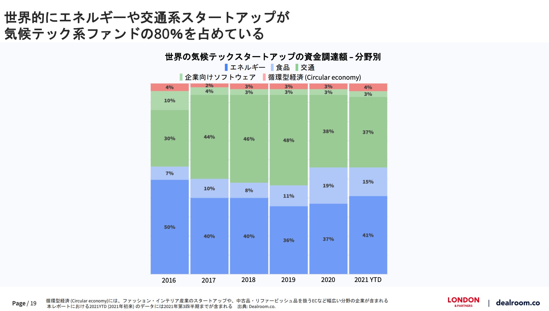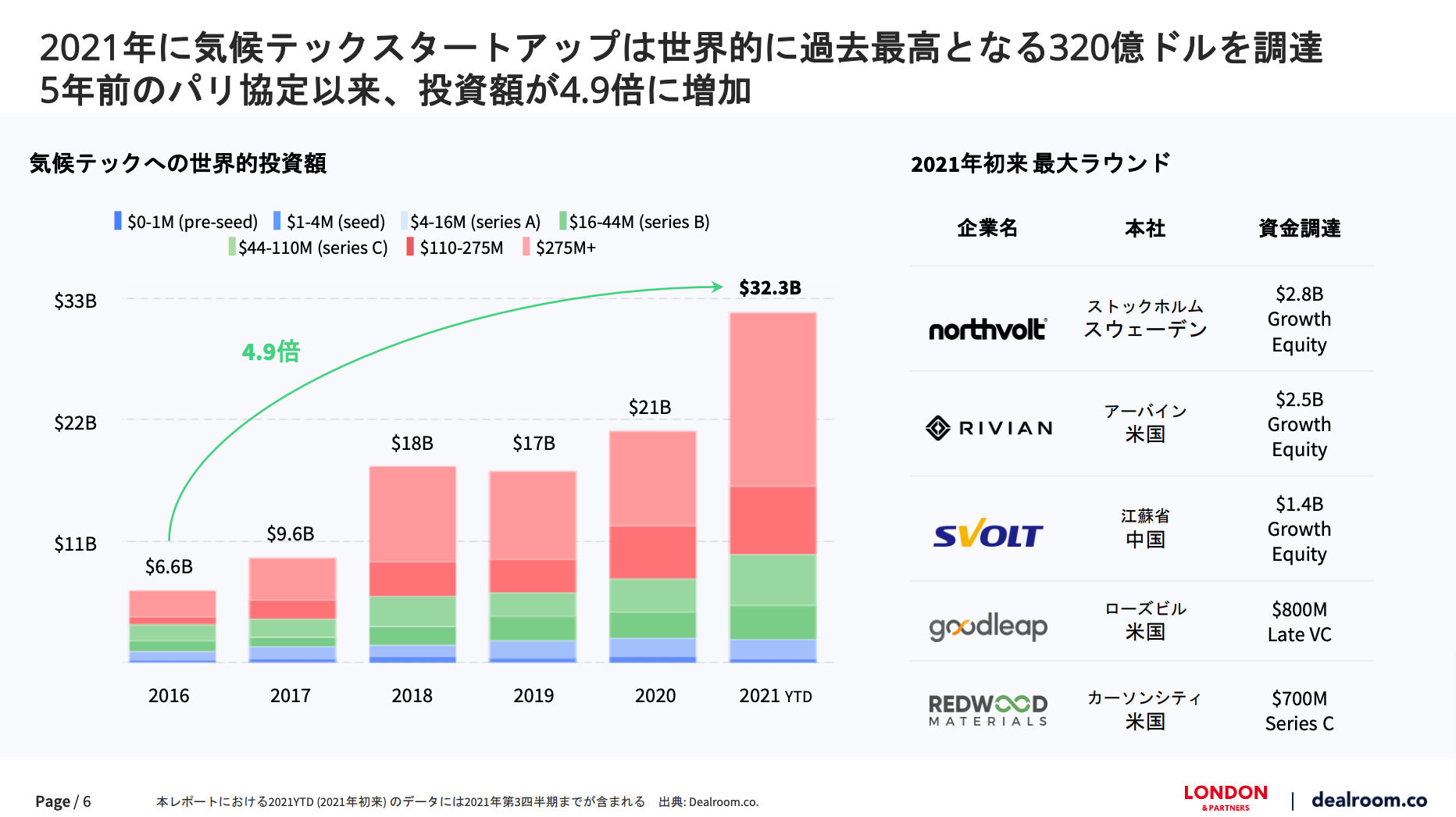 パリ協定以来、温室効果ガスの排出量を削減またはゼロにする取り組みを行う企業や、気候変動の課題に取り組む企業の数は世界的に異例の増加を見せています。また、気候テックに対するVCの投資も天井知らずに増え、2016年以降、世界の投資額は約5倍増加しています。