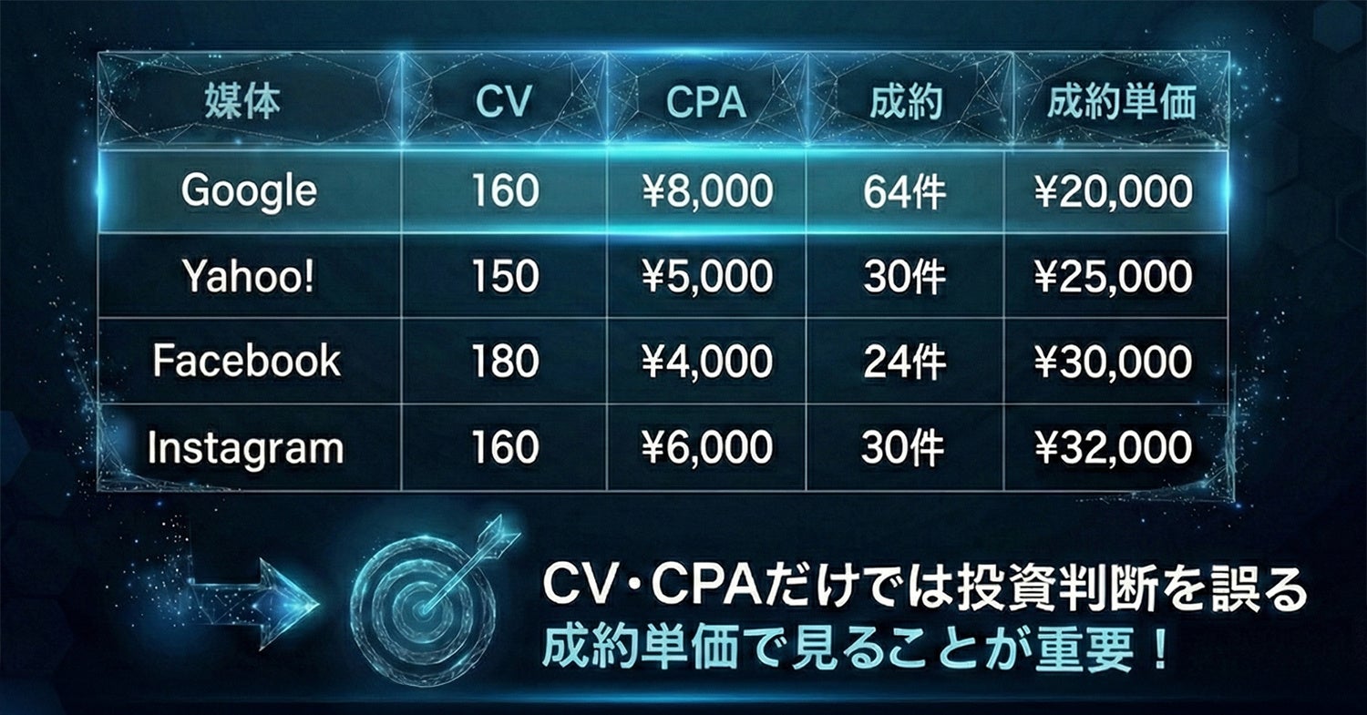 「リード件数」ではなく「成約」を広告媒体の学習指標に設定します。これにより、成約しやすい行動・属性を持つターゲットへ配信を集中させ、無駄な広告費の削減と成約数の向上を目指します 。