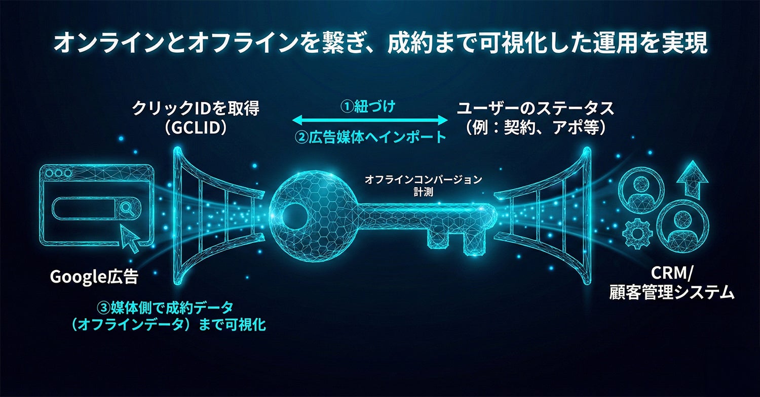 本サービスは、広告クリック時に付与されるID(GCLID等)と企業のCRM(顧客管理システム)内の成約データを紐付け、広告媒体へインポートすることで、成約から逆算した広告運用の最適化を可能にします。