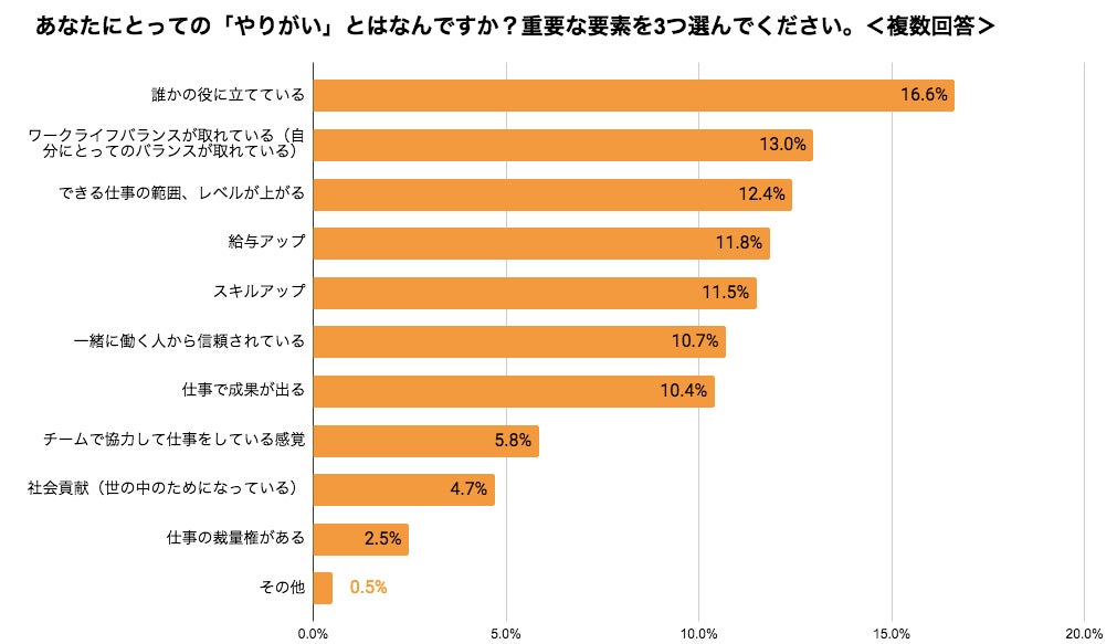 - やりがいを感じる要素は、「誰かの役に立てている」が16.6%で最多。次いで「ワークライフバランス」「できる仕事の範囲、レベルが上がる」が僅差で続き、「給料アップ」は約1割と低い結果となった。