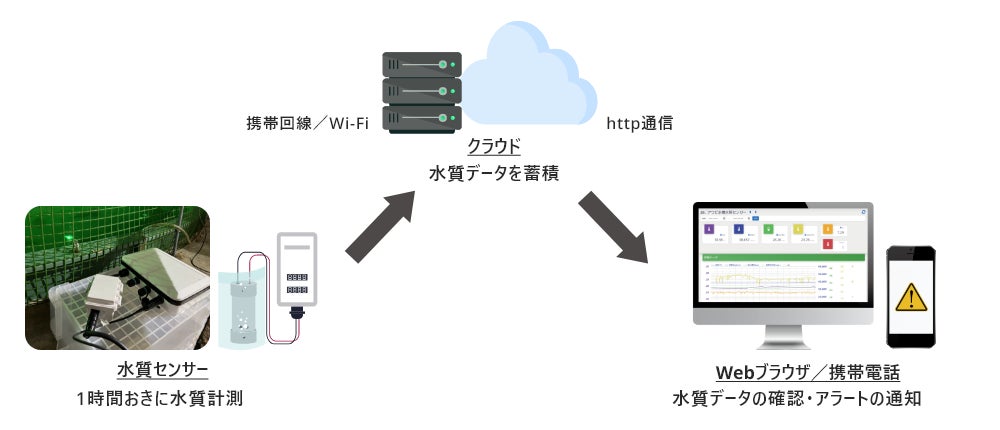 IoT水質センサーは、海上養殖や陸上養殖、河川や池の水質データを24時間・365日遠隔で管理し、Webブラウザよりリアルタイムで管理することができるサービスです。