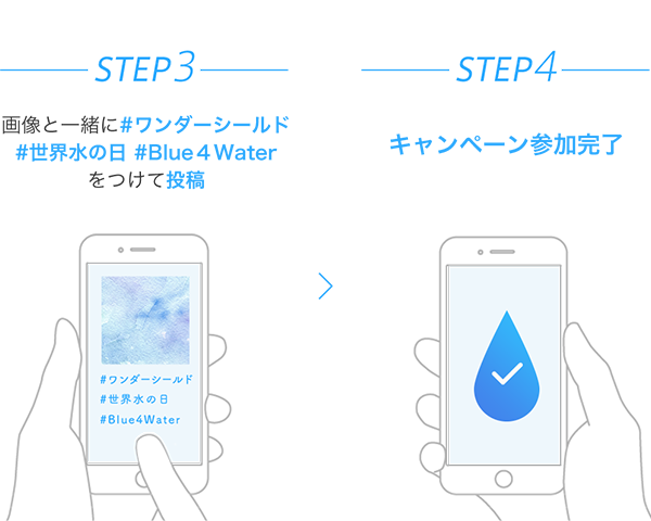 ダウンロードした画像と一緒に「#ワンダーシールド」「#世界水の日」「#Blue4Water」をつけて投稿。