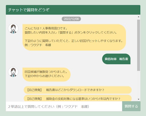 トライアルを行った後、2022年8月より業務改革推進部・人事総務部の問合せに対応する形で、全社員が使えるチャットボットとして運用を開始しました。コロナ禍におけるワークスタイルの変容等を受けて、特に個別問合せが増加していた人事総務部においては、チャットボット導入のタイミングに合わせ、人事総務関連の内容を網羅したポータルサイトを作成。ポータルサイトを開くと自動でチャットボットが立ち上がるように設定し、利用の定着化を図りました。現在、人事総務部においては、目標設定・評価、勤務体制、自己啓発、勤怠システム等、13カテゴリ/250件に及ぶFAQ(※)にチャットボットが回答できる仕組みが構築されています。8月のリリース後、月間最大1200件程度の問合せに対し自己解決率70%程度の水準となり、同部門の問合せ対応工数削減に繋がっています。また、2022年9月より新たにフレックスタイム制を導入するにあたって事前に想定質問の準備を行い、問い合わせ対応の自動化をしたことで、それ以外の業務への専念が可能になったという活用事例も創出されています。