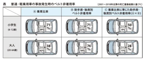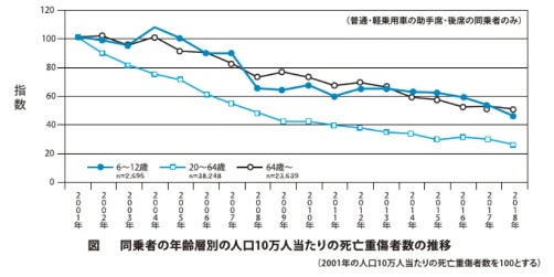 近年、交通事故における死傷者数は減少傾向にありますが、年齢別にみると、6-12歳の死傷者数の減少率が悪く、他の年齢層に比べ事故時の死傷リスクが高い傾向にあります。この原因として、後席に座る子どものシートベルト非着用率が約50%と、乗車時の安全確保が十分でないことが可能性の一つとして指摘されています。