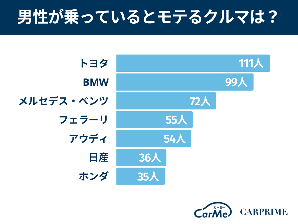 輸入車はモテるイメージがありますが、それを抑えてトヨタ車がもっとも票を集めたのは意外な結果と言えます。トヨタの中でも高級感がある、クラウンやレクサスなどが良いイメージを与えているのではないでしょうか。