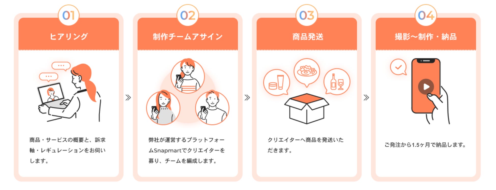 企業様は、訴求軸やレギュレーションを共有+商品発送だけでOK。オンラインで完結し、低工数・低コストでの制作を実現します。