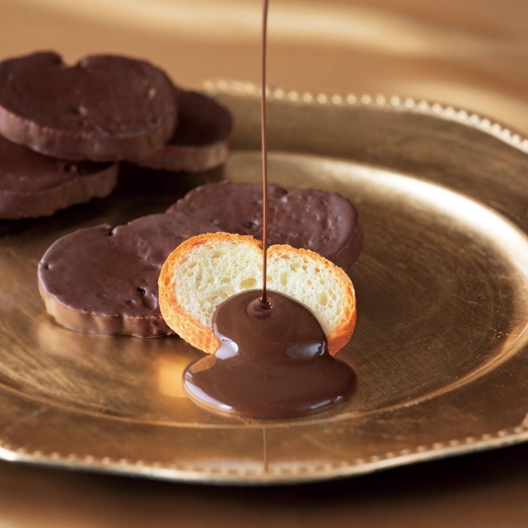 商品特徴 スイス産カルマ社のクーベルチュールと、国産のクーベルチュールを複数ブレンド。北海道産フレッシュバターの上澄みだけを贅沢に使用したプレミアムバターラスクにチョコをコーティングしました。