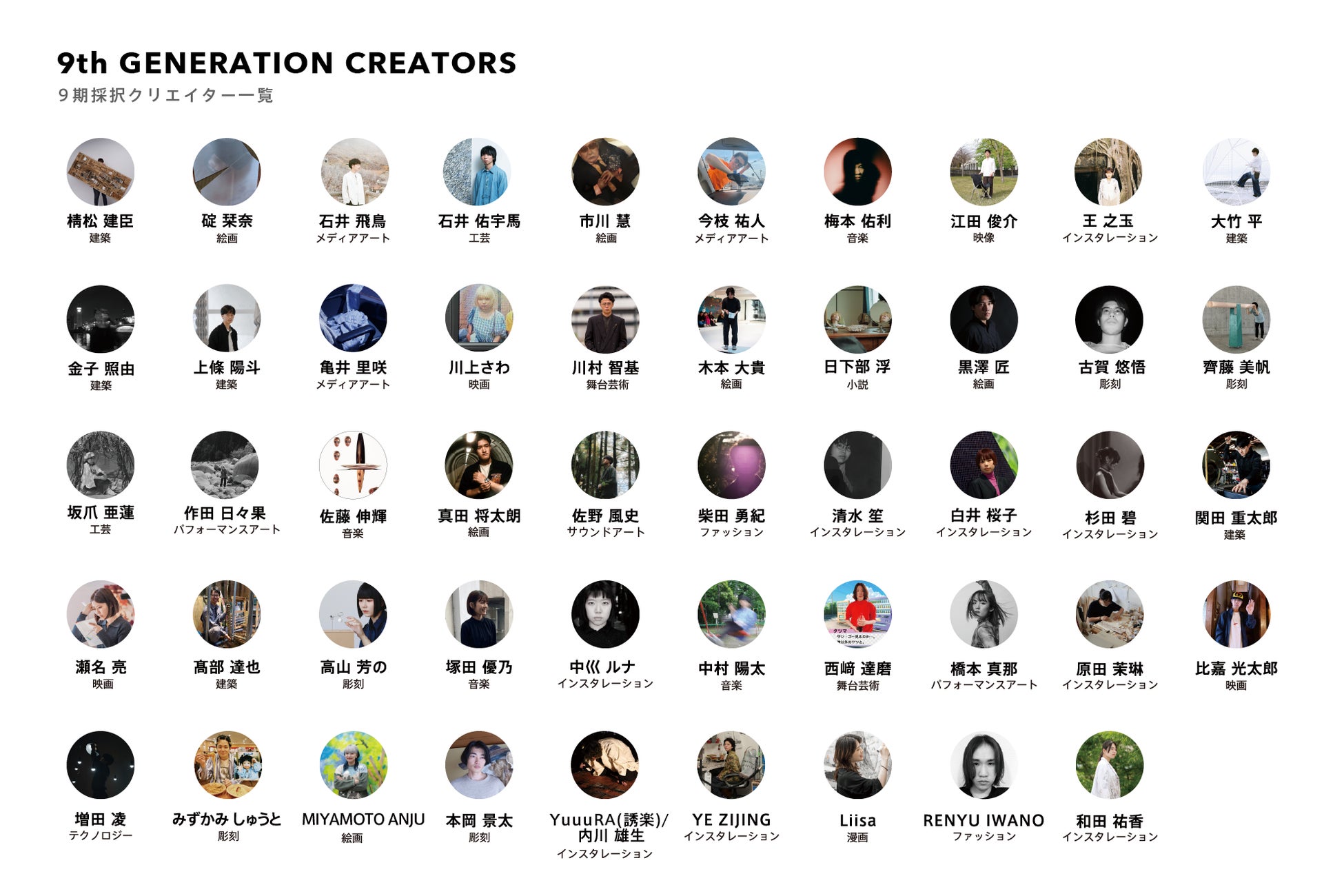 棈松 建臣(建築)|碇 栞奈(絵画 / インスタレーション)|石井 飛鳥(メディアアート / 実験美学)|石井 佑宇馬(工芸)|市川 慧(絵画)|今枝 祐人(メディアアート / 詩 / 短歌)|岩野 蓮祐(ファッション)|梅本 佑利(音楽)|江田 俊介(映像 / 建築)|王 之玉(インスタレーション)|大竹 平(建築)|金子 照由(建築)|上條 陽斗(建築 / コンピューテーショナルファブリケーション)|亀井 里咲(メディアアート / キネティックエッセイ)|川上さわ(映画 / 劇映画 / 日記映画)|川村 智基(舞台芸術 / 会話劇 / パフォーマンス)|木本 大貴(絵画 / メディアアート / パフォーマンス / インスタレーション)|日下部 浮(小説 / 現代美術)|黒澤 匠(絵画)|古賀 悠悟(彫刻 / インスタレーション / 都市)|齊藤 美帆(彫刻)|坂爪 亜蓮(工芸 / 金属造形)|作田 日々果(パフォーマンスアート / 実演)|佐藤 伸輝(音楽)|真田 将太朗(絵画)|佐野 風史(音楽 / サウンドアート / テクノロジー)|柴田 勇紀(ファッション / 衣服 / インスタレーション)|清水 笙(インスタレーション)|白井 桜子(インスタレーション)|杉田 碧(インスタレーション / 映像インスタレーション)|関田 重太郎(建築 / 企画設計)|瀬名 亮(映画)|髙部 達也(建築 / インフラ)|高山 芳の(彫刻 / キネティックアート / デザイン)|塚田 優乃(音楽 / 作曲)|中巛 ルナ(インスタレーション)|中村 陽太(音楽)|西﨑 達磨(舞台芸術)|橋本 真那(パフォーマンスアート)|原田 茉琳(インスタレーション)|比嘉 光太郎(映画 / ホラー・オカルト映画 / オカルト研究家)|増田 凌(テクノロジー)|みずかみ しゅうと(彫刻)|MIYAMOTO ANJU(絵画)|本岡 景太(彫刻)|YuuuRA(誘楽)・内川雄生(インスタレーション / 書 / 現代書道)|YE ZIJING(インスタレーション)|Liisa(漫画 / インスタレーション)|和田 祐香(インスタレーション)