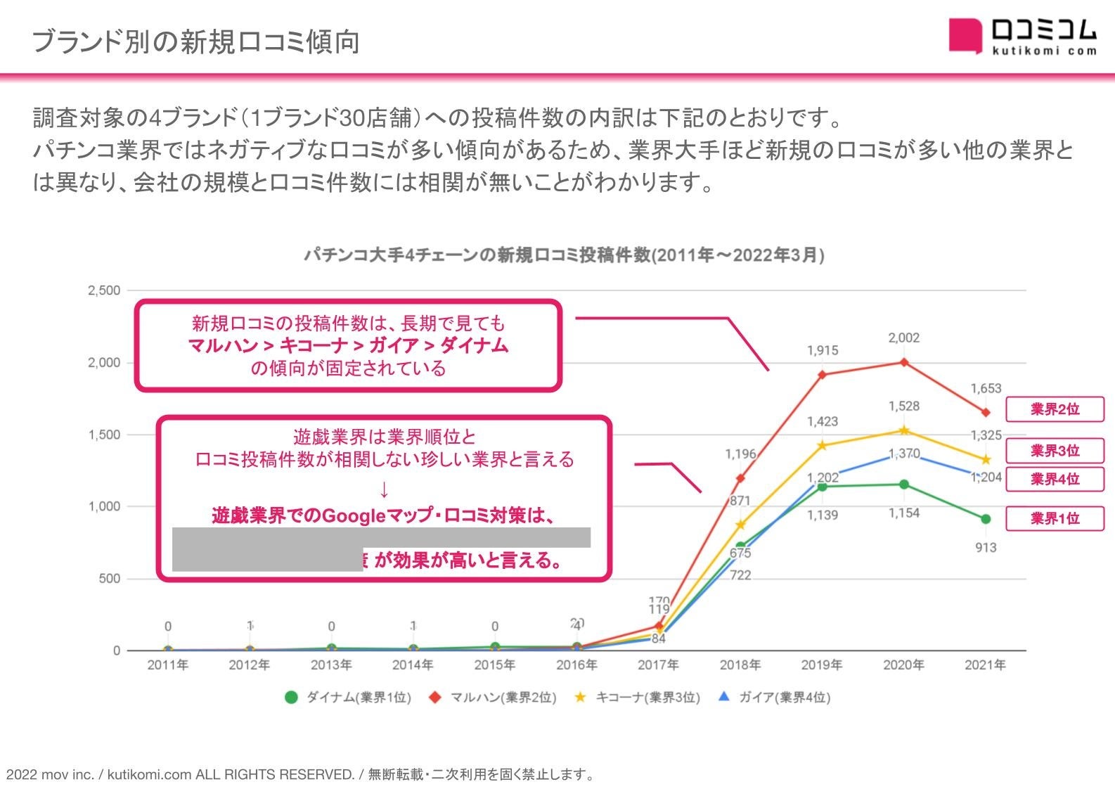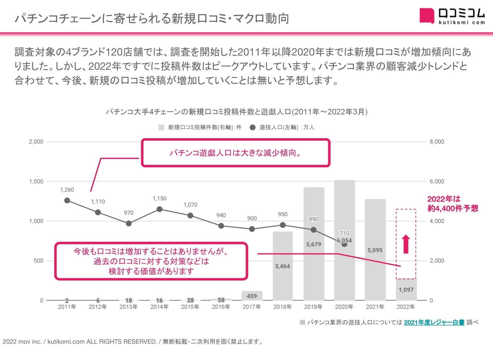 調査対象の4ブランド120店舗では、2011年以降の調査期間において、2020年までは新規口コミが増加傾向にありました。ですが、2022年現在投稿件数はピークアウトしており、パチンコ業界の顧客減少トレンドもあいまって、今後新規の口コミ件数が増加することはないと予想します。