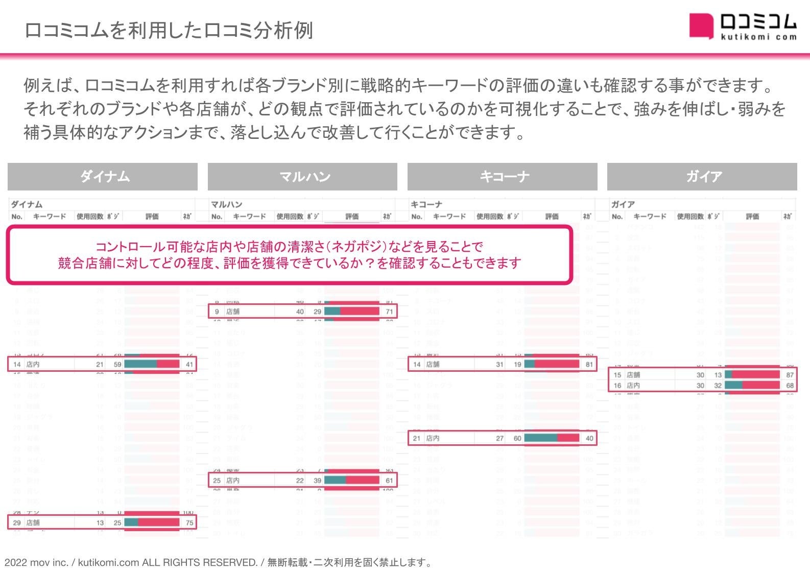 お客様の声のDXサービス「口コミコム」を運営する株式会社mov(代表取締役:渡邊 誠、本社:東京都渋谷区、以下mov)は、「口コミコム」独自の「分析機能」を用い、「全国のパチンコ大手4ブランド」の口コミ分析レポートを作成しました。