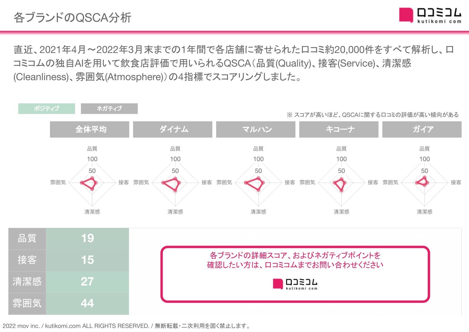 さらに、口コミコムの独自AIを用いて、直近1年間で各店舗に寄せられた口コミ約20,000件を解析、QSCAの4指標でスコアリングしました。