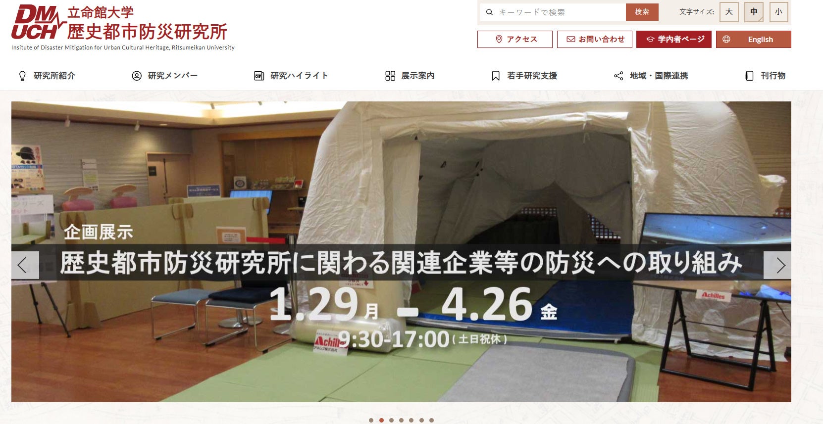 歴史都市防災研究所では、従来、文化遺産防災、あるいは歴史都市防災という研究課題の下で別々に進められてきた人文社会と理工学の学問分野を連携・融合させることで、新たな研究テーマに取り組んでいます。アーカイブ等の情報技術を駆使する立命館大学アート・リサーチセンターとも共同しつつ、国内外の人材と研究プロジェクトが集うプラットフォームを構築している研究所です。