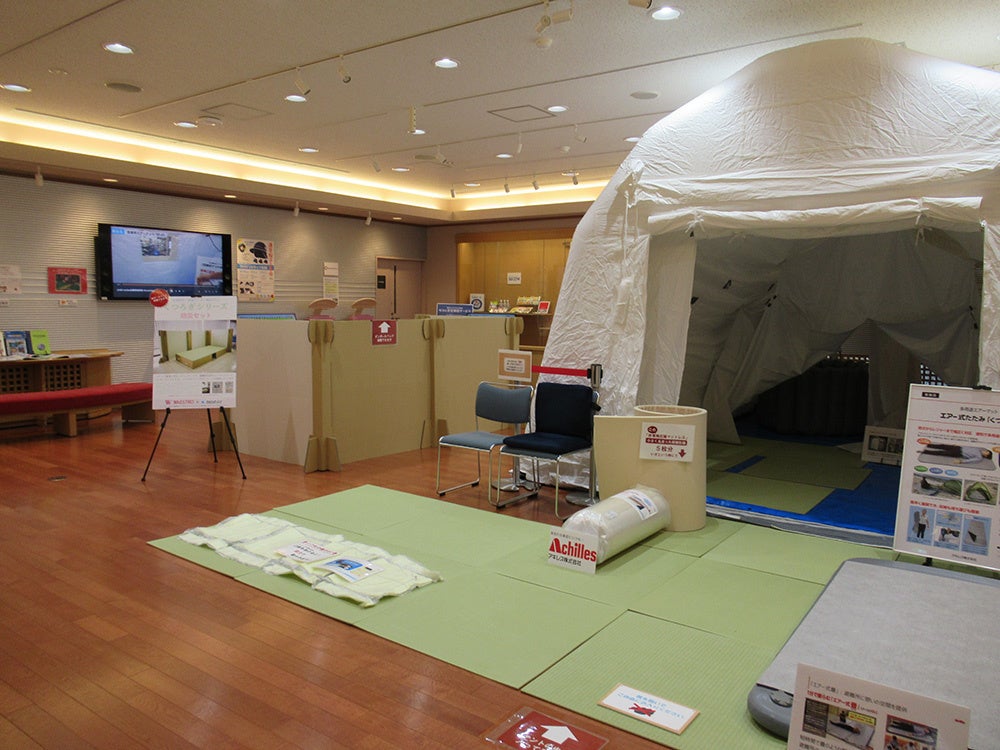 株式会社ピーカブーの簡易ヘルメット入りUV対策制帽は、歴史都市防災研究所の実践的な防災技術製品の一つとして、「歴史都市防災研究所に関わる関連企業等の防災への取り組みの企画」に展示されました。
