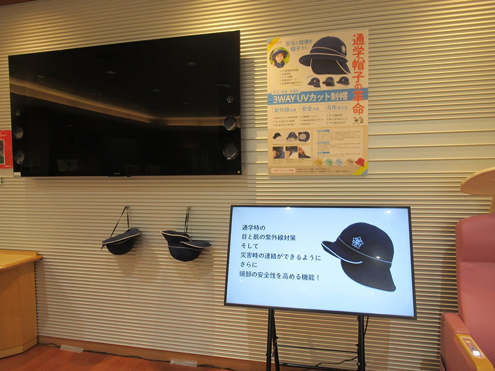 簡易ヘルメット入りのUVカット制帽は、子供たちの通学や日常生活に必要なものだと理解いただき、展示をしていただけました。