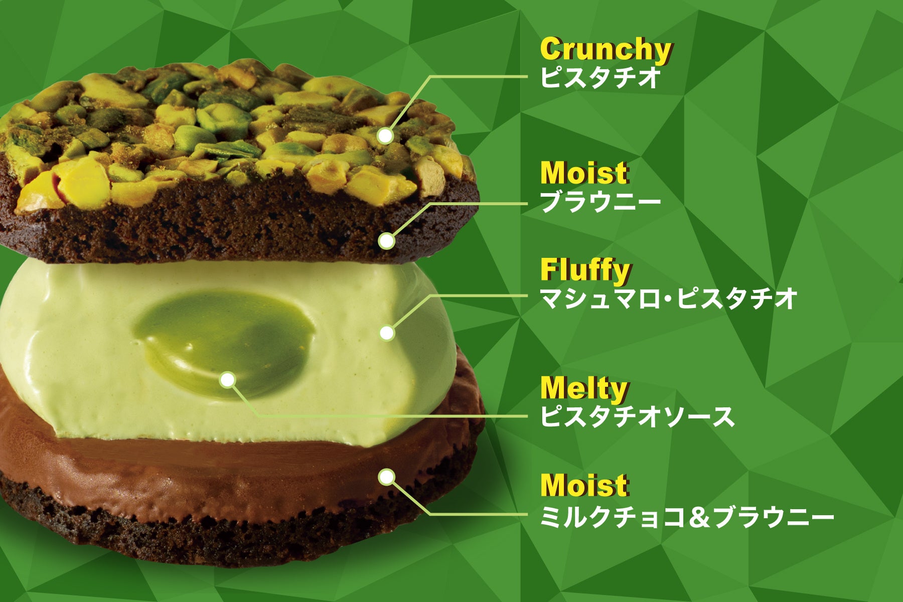 上部にピスタチオをぎっしりと敷き詰めたピスタチオチョコブラウニーはピスタチオが絶妙にローストされ、香ばしさや旨味をしっかりとお楽しみいただけます。下部のチョコレートブラウニーはミルクチョコレートでコーティングすることで、マシュマロとピスタチオの美味しさを優しく引き立てます。上下のブラウニーで挟むのは『ベイクドマロウ』自慢のふわふわの焼マシュマロ・ピスタチオ。一つ一つ丁寧に焼かれたマシュマロの中からはピスタチオソースがとろりととろけ出します。普段は常設店舗でしかお買い求めいただけない、どこを食べてもピスタチオづくしの新作をこの機会にぜひご賞味ください。