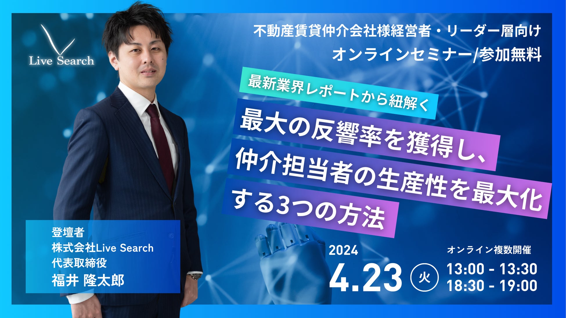 不動産会社を顧客とし物件撮影サービス導入シェアNo.1を獲得した株式会社Live Search(本社:福岡県福岡市中央区、代表取締役:福井 隆太郎)が、不動産経営者やリーダー層に向けて参加費無料の30分オンラインセミナーを開催します。本セミナーでは、最新の業界レポートを紐解きながら最大の反響率を得る方法や、仲介担当者の生産性を最大化するベストプラクティスをお伝えします。