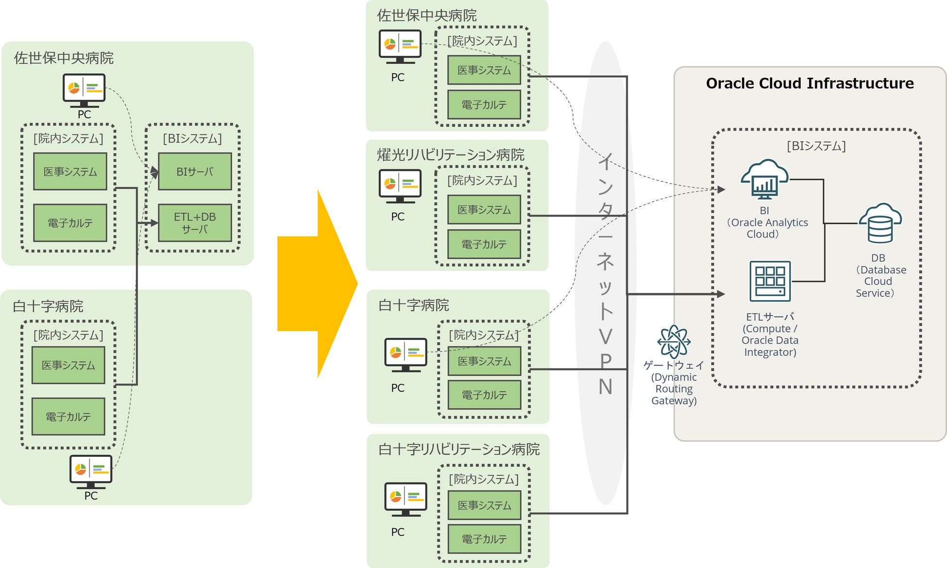 クロスキャットは、今回のシステム構築にあたり、クラウド基盤やデータベース、BIなど全てにおいて日本オラクル社のソリューションを採用し、コストを抑えたバージョンアップ、導入後のランニングコストの削減、運用管理の作業負荷軽減などの課題を解決しました。新たなシステムでは、Oracle Cloud Infrastructure(OCI)上にあるOracle Data Integratorにより、インターネットVPN経由で4つの病院(佐世保中央病院、燿光リハビリテーション病院、白十字病院、白十字リハビリテーション病院)の医事システムや電子カルテシステム等の院内データを抽出し、分析に最適な形で変換・加工してデータベースに格納します。その後、BIツールのOracle Analytics Cloudでデータ分析や可視化を行います。