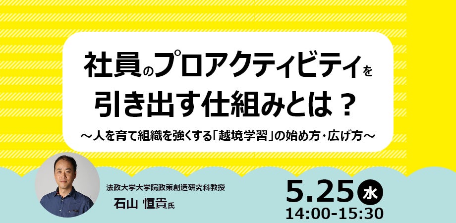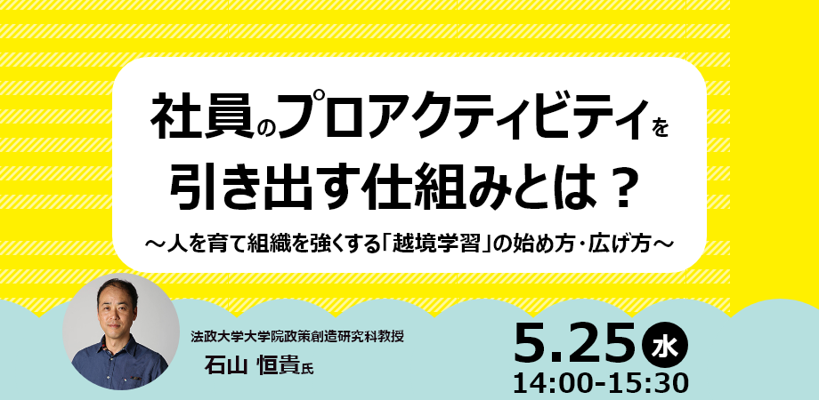 本ウェビナーでは、「越境学習入門」の著者であり、越境学習の第一人者の法政大学大学院政策創造研究科 教授 石山恒貴さんをお招きし、越境学習の始め方、そして組織への波及方法について、対話中心ディスカッション形式でお話しいただきます。