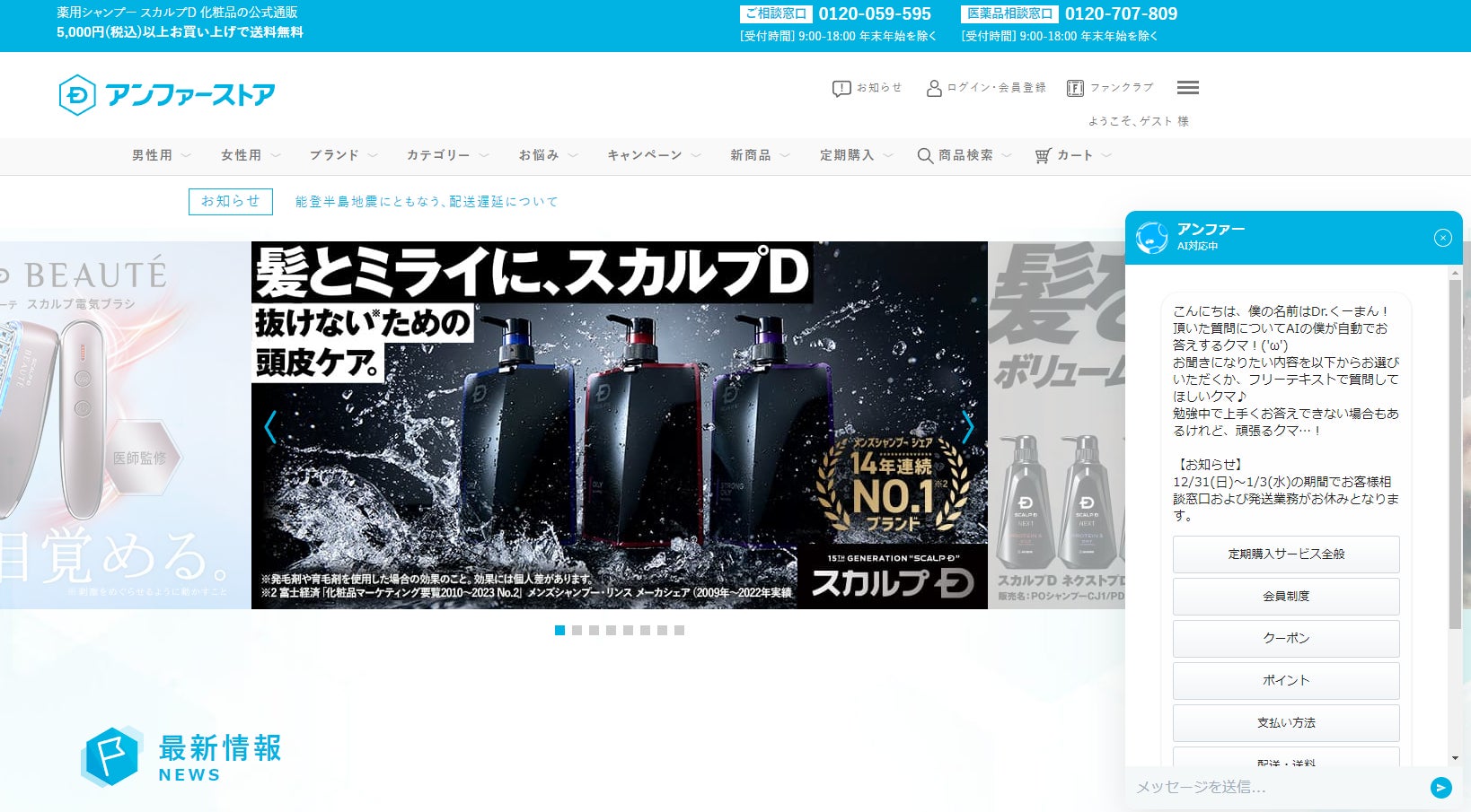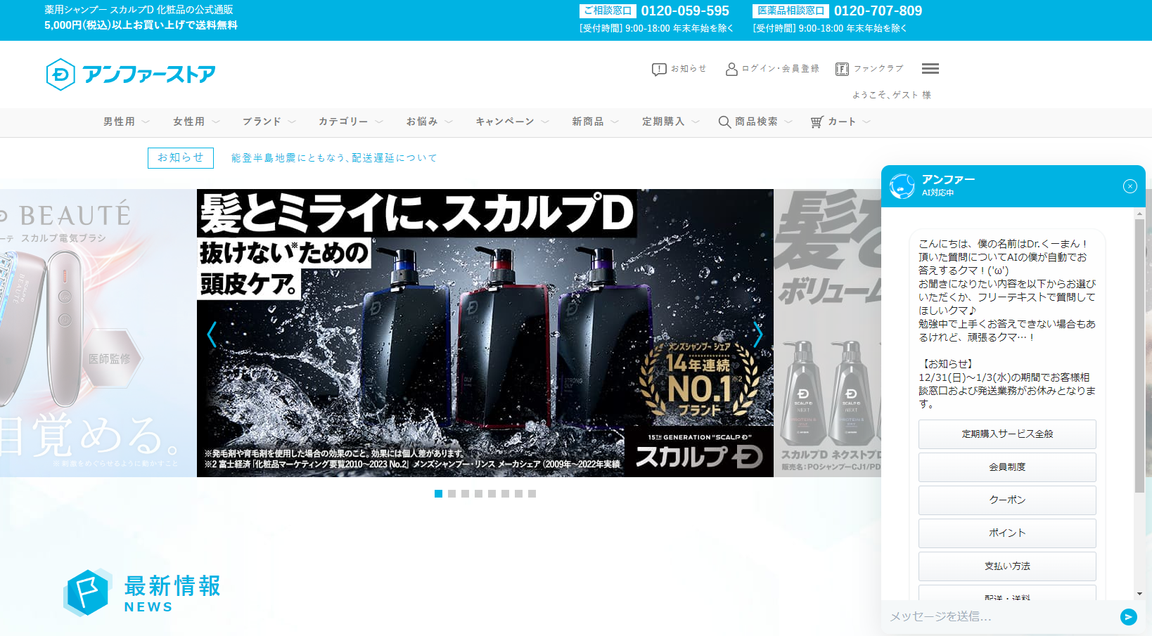 アンファーが運営する公式通販の問い合わせ対応チャネルとして、AIチャットボット「KARAKURI chatbot」を導入し、24時間365日の自動対応の体制を構築いたしました。またスカルプDという「悩み商材」への問い合わせハードルを下げる役割を持ち、お客さまの見えないニーズの可視化・お困りごとの発掘を実現しております。