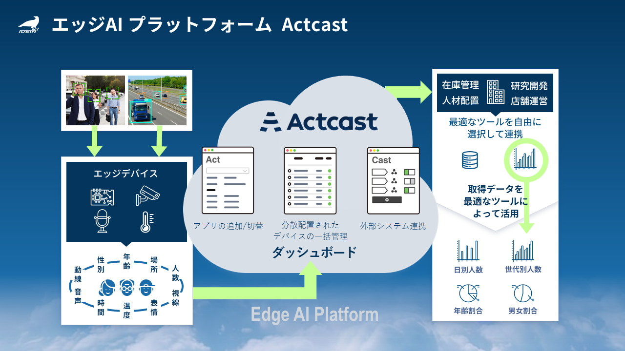 Ideinは、エッジAI技術を核としたプラットフォーム「Actcast」(読み:アクトキャスト)を提供し、実用的なAI/IoTシステムを開発・導入・活用する開発者及び事業会社へのサービス提供を行っています。