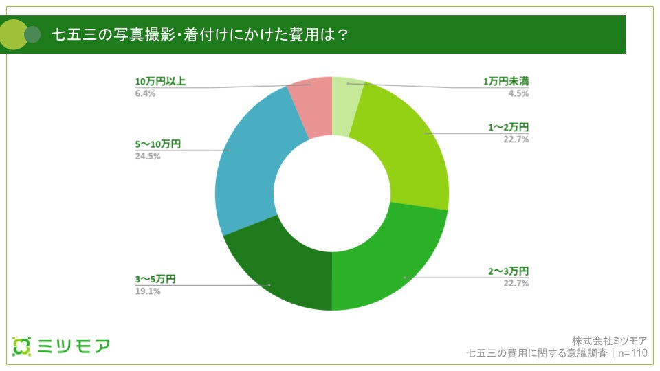 七五三の写真撮影・着付けのみにかけた費用を質問したところ、最多価格帯は1-2万円(22.7%)、2-3万円(22.7%)、5-10万円(24.5%)で、比較的幅広い価格帯に分散しています。