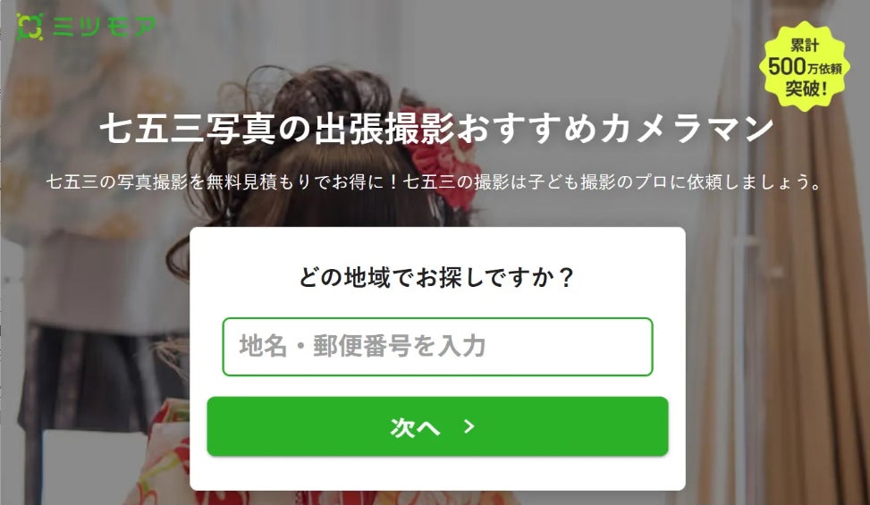 業者を比較して選べるオンライン見積もりプラットフォーム「ミツモア」では、七五三の出張撮影や、出張着付けのプロを簡単に比較できます。口コミや料金、事例写真を見比べて満足のいく予算と仕上がりを実現できるプロを見つけましょう。