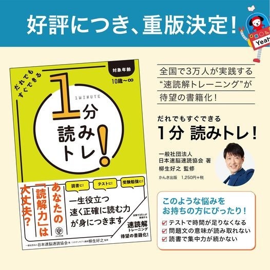 速読の普及活動及び受講者への情報発信などをおこなう一般社団法人日本速脳速読協会(本部:東京都中央区、代表: 高橋 智恵)が、株式会社かんき出版を通じて、2022年6月22日に発売した書籍『1分読みトレ!』の重版が決定いたしました。