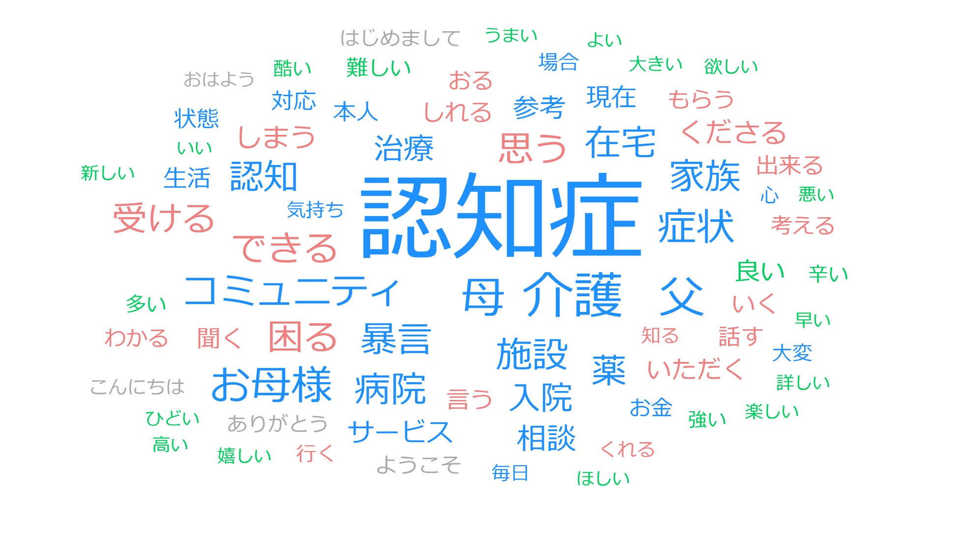 株式会社アナムネ(本社:東京都中央区、代表取締役CEO:菅原 康之、以下「アナムネ」)は、認知症月間に合わせた企業の社会貢献活動として、当社が運営する「おうち病院 疾患コミュニティ(認知症患者コミュニティ)」におけるユーザー同士のやり取りについてテキストマイニングを行い、認知症患者およびその家族がどんな悩みを抱えているかを分析し、認知症家族の実情理解に貢献する取り組みを実施しました。