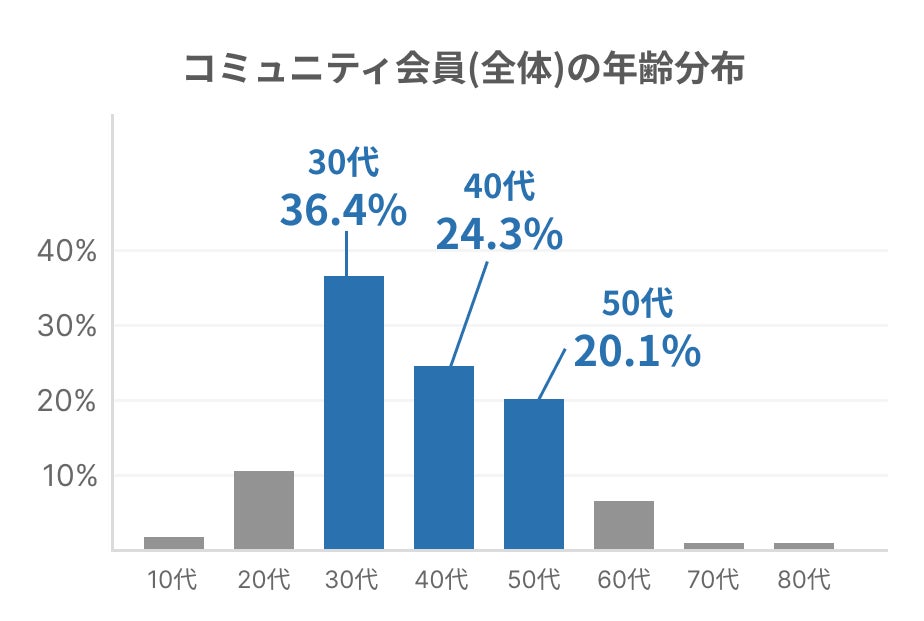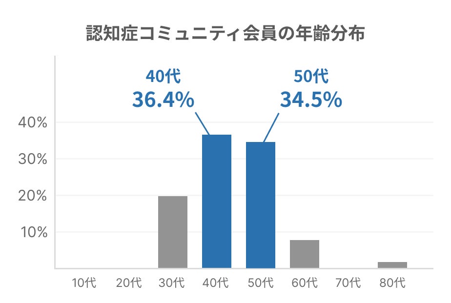 認知症患者コミュニティの利用者は、20代~50代で全体の91%を占め、特に40代・50代が圧倒的に多いです。コミュニティ全体での会員の年齢分布は30代が最も多い山となっていることと比べると、父母や祖父母に認知症の課題が発生するのが、働いている人の中でも40代・50代というベテラン世代であることを示していると考えられます。