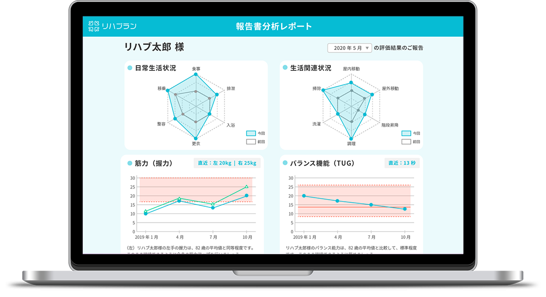 「リハプラン」は、2018年3月のサービス開始以来、機能訓練業務を誰でも簡単・安心・効果的に行える「デイサービス向けリハビリ支援ソフト」として、職員の書類業務負担を軽減、介護事業所の差別化・売上アップを支援してまいりました。当社がすでに技術特許(特許第6792892号)を取得しているリハビリプログラムの自動提案技術により、リハビリ専門職でなくても利用者ごとに最適なリハビリ計画の立案が可能になります。これにより、通常30分程度かかる計画策定が約3分程度に短縮できます。また、「リハプラン」が有する2,200種類の運動プログラムから、リハビリ方法の具体的なプログラムにも悩むことなく指導することができます。