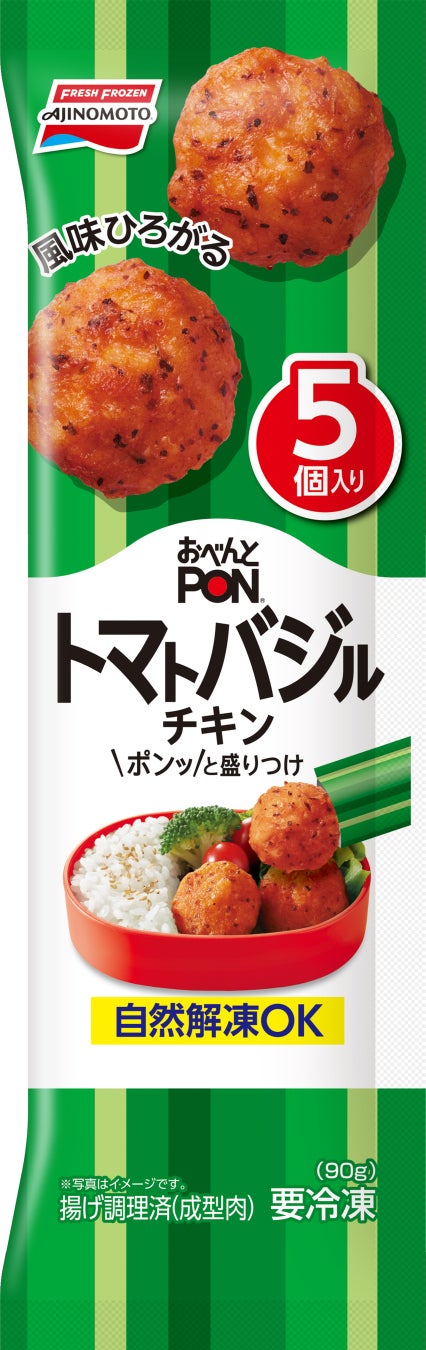 このたび、この「おべんとPON®」に新たに<トマトバジルチキン>が仲間入りしました。トマトとバジルの風味が広がる洋風な味付けに仕上げています。「おべんとPON®」はシリーズ全6品種の品ぞろえで展開します。